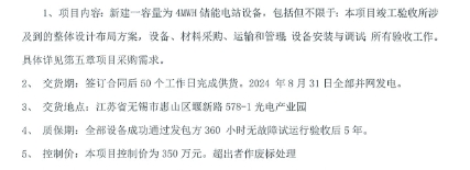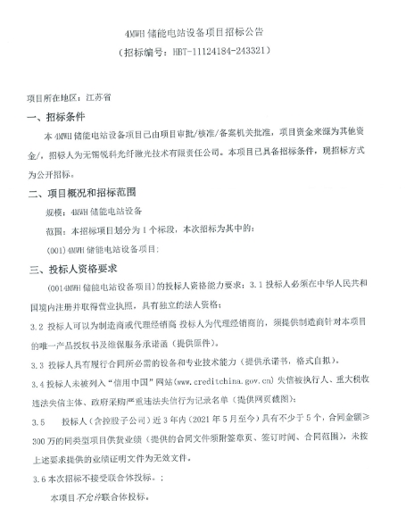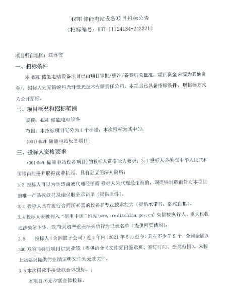 近日,无锡锐科光纤激光技术有限责任公司启动4MWH储能电站设备项目招标。