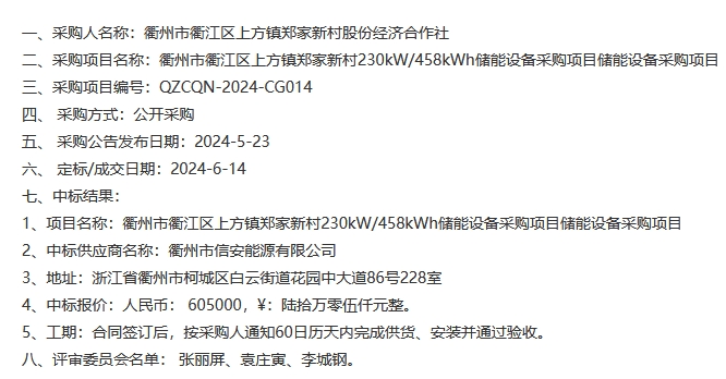6月14日,浙江省衢州市衢江区上方镇郑家新村230kW/458kWh储能设备采购项目储能设备采购项目中标结果公告发布,项目招标人为衢州市衢江区上方镇郑家新村股份经济合作社,衢州市信安能源有限公司以60.5万元中标该项目,折合单价1.321元/Wh。