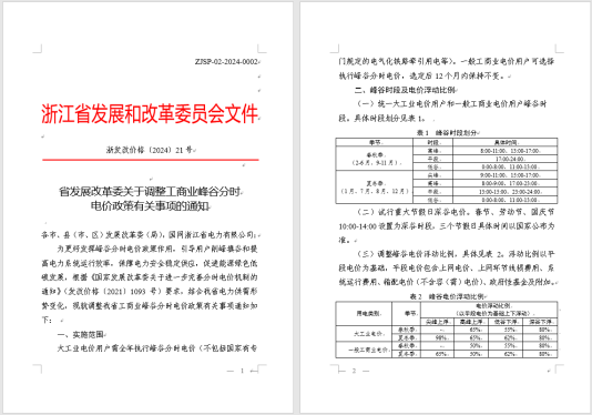 浙江工商业分时电价标准依据的是《关于调整工商业峰谷分时电价政策有关事项的通知(浙发改价格〔2024〕21号)》,其对分时时段划分为:春秋季(2-6 月、9-11 月,共 8 个月)峰谷时段调整为高峰、平段、低谷等三个时段。其中,高峰时段共 7 个小时,平段时段共 7 个小时,低谷时段共 10 个小时。夏冬季 ( 1、7、8、12 月,共 4 个月)峰谷时段调整为尖峰、高峰、平段、低谷等四个时段。