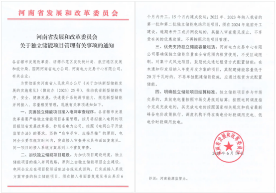 2024年6月19日,河南省发展和改革委员会发布了《关于独立储能项目管理有关事项的通知》,以推动河南省新型储能有序、安全、健康发展,快速提升系统调节能力,规范新型储能并网接入、容量租赁管理等。通知从完善独立储能项目接入电网审查程序、加快独立储能项目建设、优先支持独立储能容量租赁、明确独立储能项目结算标准四个方面进行规范。
