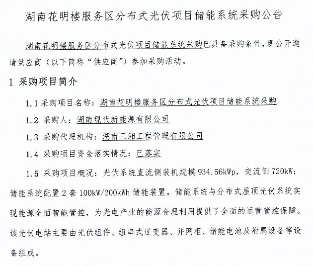近日,湖南花明楼服务区分布式光伏项目储能系统采购公告发布,项目招标人为湖南现代新能源有限公司,位于湖南省长沙市宁乡县,储能系统配置2套100kW/200kwh储能装置,项目资金来源为国有资金51.40万元,折合单价1.285元/Wh。