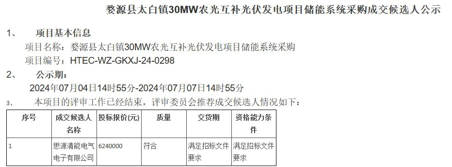 7月4日,中核集团江西省婺源县太白镇30MW农光互补光伏发电项目储能系统采购成交候选人公示,项目位于江西省上饶市婺源县太白镇,采购需求为6MW/12MWh储能系统设备一套,项目预中标人为思源清能电气电子有限公司,投标报价624万元,折合单价0.52元/Wh。