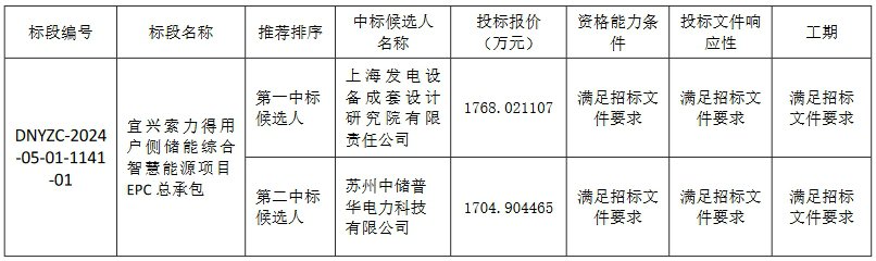 第一中标候选人为上海发电设备成套设计研究院有限责任公司,投标报价1768.021107万元,折合单价0.982元/Wh。