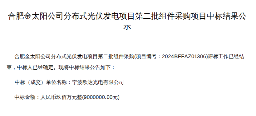 7月17日,合肥金太阳公司分布式光伏发电项目第二批组件采购项目中标结果公布,中标企业宁波欧达光电有限公司,中标价格9000000元,单价0.75元/W。