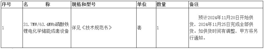 1、包括相关31.7MW/63.4MWh磷酸铁锂电化学储能成套设备、电池簇、BMS、汇流柜等配套附件、备品备件、专用工具、仪器仪表,以及服务等具体范围详见技术规范书。