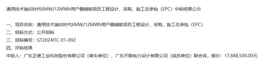 广东正德工业科技股份有限公司、广东天联电力设计有限公司中标该项目,报价1768.85万元,折合单价1.474元/Wh。