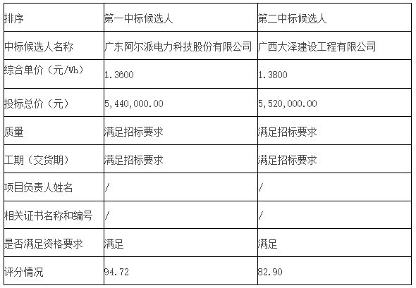 项目第一中标候选人为广东阿尔派电力科技股份有限公司,投标报价544万元,综合单价1.36元/Wh;