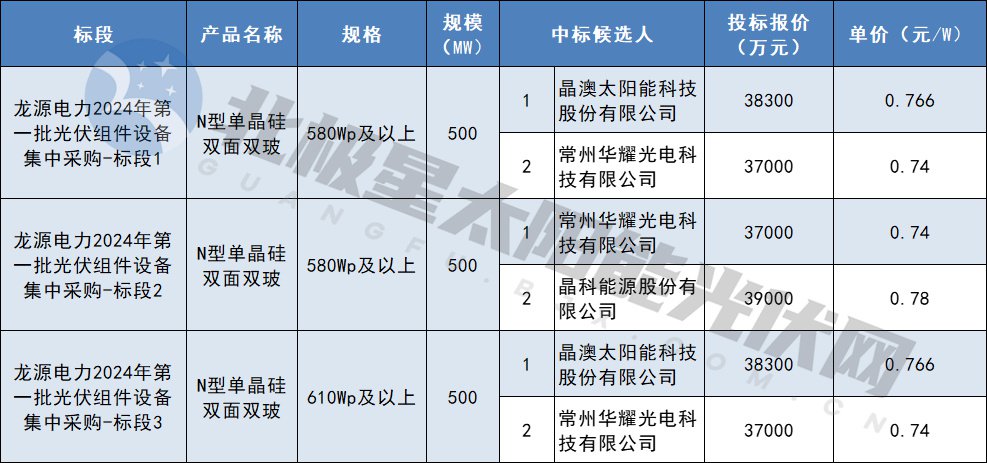 8月6日,龙源电力2024年第一批光伏组件设备集中采购公开招标中标候选人公布,入围企业有晶澳太阳能科技股份有限公司、常州华耀光电科技有限公司、晶科能源股份有限公司。