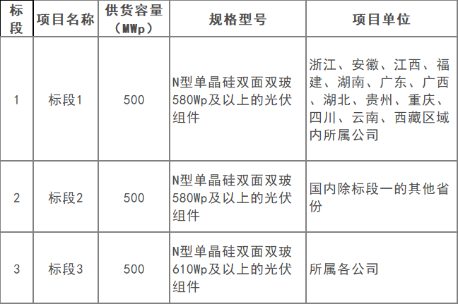 招标公告显示,龙源电力2024年第一批光伏组件设备集中采购招标规模1500MW,分为3个标段,详情如下:
