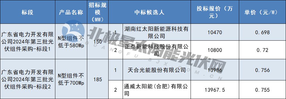 8月16日,广东省电力开发有限公司2024年第三批光伏组件采购中标候选人公布,入围企业来自于湖南红太阳新能源科技有限公司、正泰新能科技股份有限公司、天合光能股份有限公司、通威太阳能(合肥)有限公司。