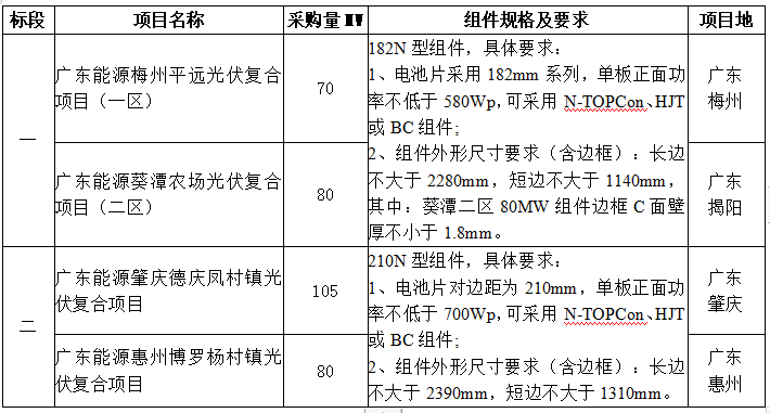 招标公告显示,本招标项目为广东省电力开发有限公司2024年第三批光伏组件集中采购,包括广东省电力开发有限公司及其子公司投资建设的四个光伏项目,分为两个标段,标段一暂定150MW,标段二暂定185MW。