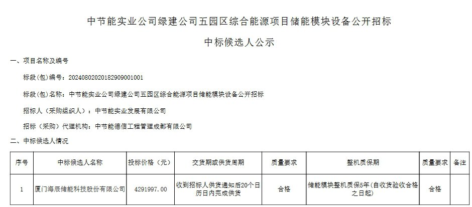 9月13日,中节能实业公司绿建公司五园区综合能源项目储能模块设备公开招标中标候选人公示,厦门海辰储能科技股份有限公司以429.1997万元预中标该项目,折合单价0.74元/Wh。