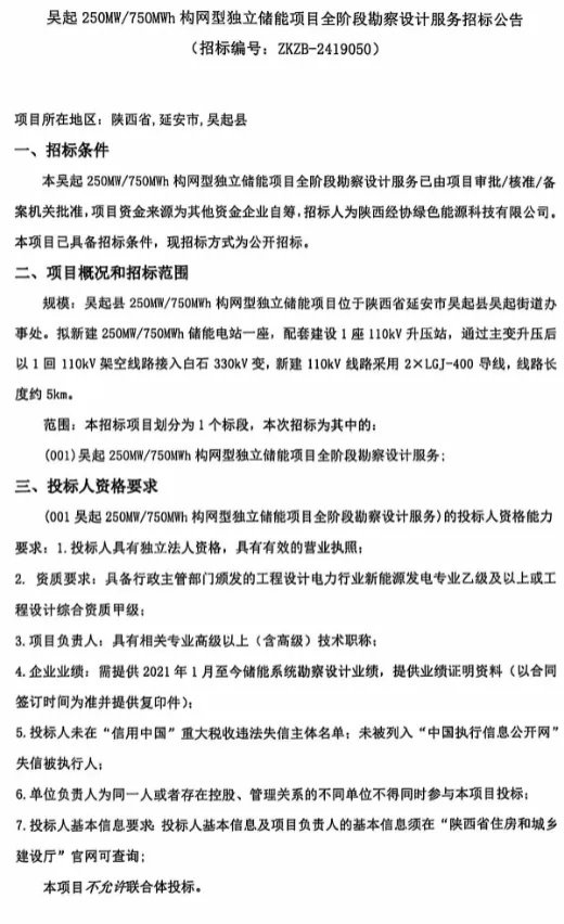 9月18日,陕西志丹200MW/600MWh构网型独立储能项目、吴起250MW/750MWh构网型独立储能项目全阶段勘察设计服务招标公告发布。合计规模为450MW/1350MWh。