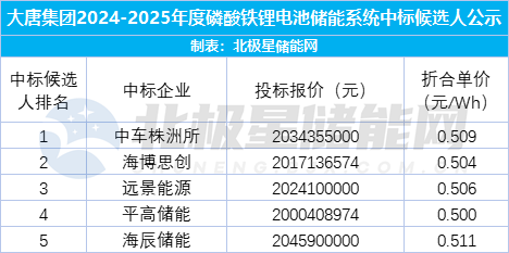 9月20日,中国大唐集团发布2024-2025年度磷酸铁锂电池储能系统中标候选人。最终中车株洲所、海博思创、远景储能、平高储能、海辰储能5家企业入围。最高报价为海辰储能0.511元/Wh,最低报价为平高储能0.5元/Wh。