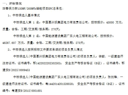 第一中标候选人为中国葛洲坝集团电力有限责任公司,投标报价45000万元,折合单价1.5元/Wh;