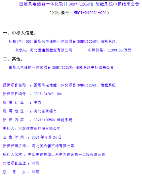 9月24日,河北围场风电储能一体化项目30MW/120MWh储能系统中标结果公告发布。