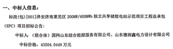 9月24日,泽安济南莱芜区200MW/400MWh独立共享储能电站示范项目工程总承包(EPC)项目中标公示,国网山东综合能源服务有限公司、山东德润鑫电力设计有限公司以43504.0449万元中标该项目,折合单价1.088元/Wh。