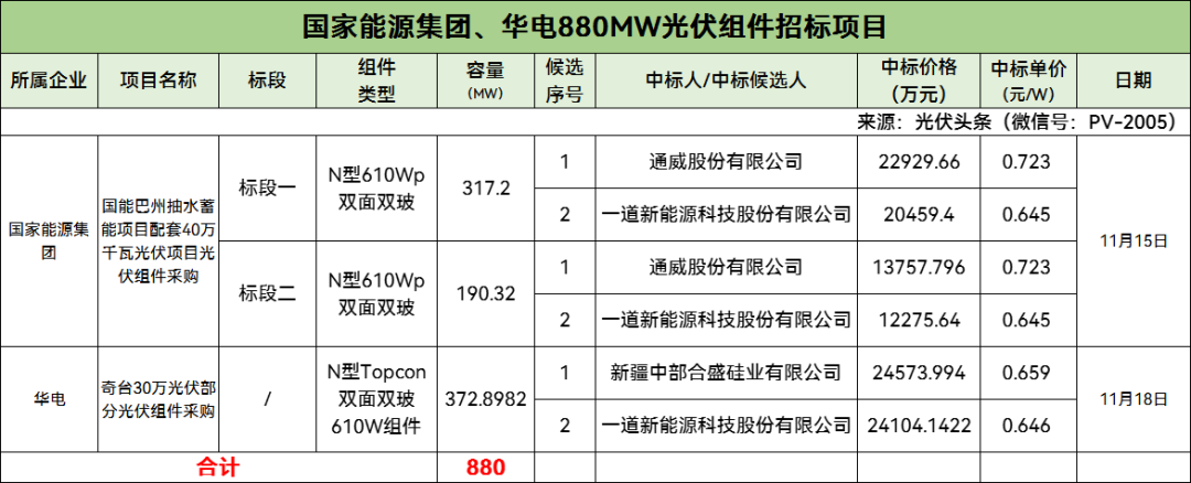 11月15日,国家能源集团新疆电力巴州发电公司国能巴州抽水蓄能项目配套40万千瓦光伏项目光伏组件采购公开招标中标候选人公示。11月18日,新疆华电古尔班通古特沙漠基地135万千瓦新能源项目奇台30万光伏部分光伏组件采购中标候选人公示。两个项目合计880MW。