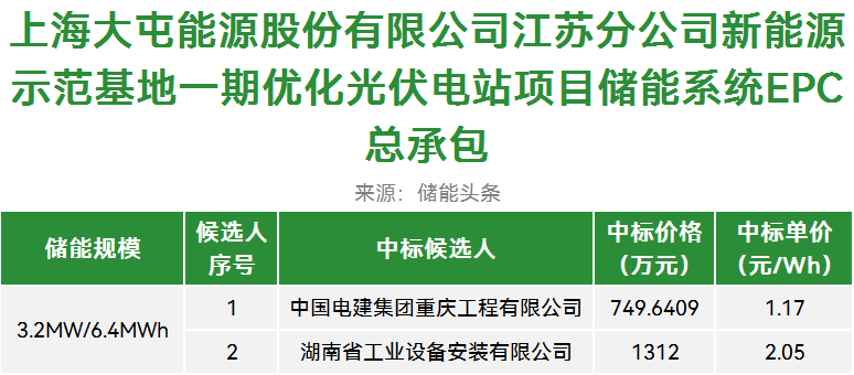 第一中标候选人为中国电建集团重庆工程有限公司,投标报价749.6409万元,折合单价1.17元/Wh;第二中标候选人为湖南省工业设备安装有限公司,投标报价1312万元,折合单价2.05元/Wh。