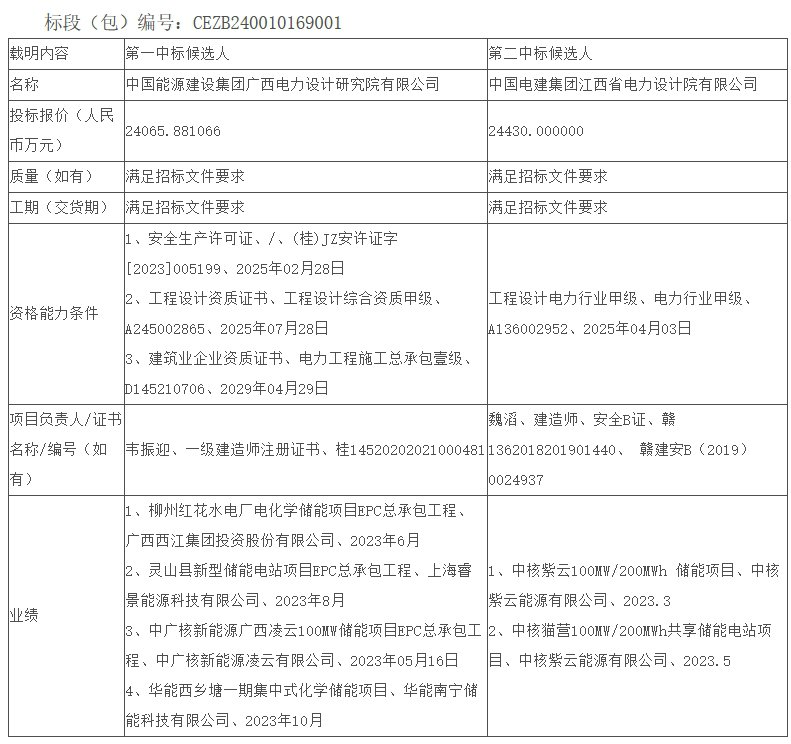 中国能源建设集团广西电力设计研究院有限公司位列第一中标候选人,投标报价24065.881066万元,折合单价0.602元/Wh;