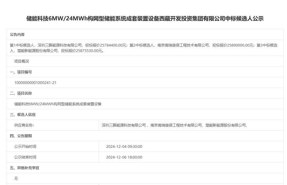 12月3日,西藏开发投资集团发布储能科技6MW/24MWh构网型储能系统成套装置设备西藏开发投资集团有限公司中标候选人公示。