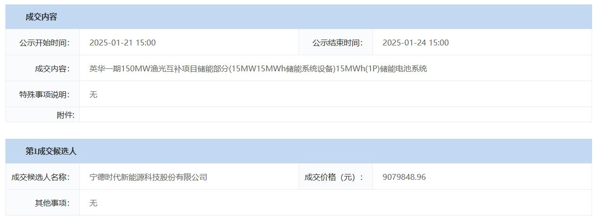 1月21日,英华一期150MW渔光互补项目储能部分(15MW15MWh储能系统设备)15MWh(1P)储能电池系统中标候选人公示,宁德时代新能源科技股份有限公司以907.984896万元预中标该项目,折合单价0.605元/Wh。