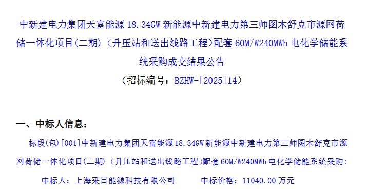 2月8日,中新建电力集团天富能源18.34GW新能源中新建电力第三师图木舒克市源网荷储一体化项目(二期)(升压站和送出线路工程)配套60M/W240MWh电化学储能系统采购成交结果公告发布,上海采日能源科技有限公司以0.46元/Wh单价中标该项目。