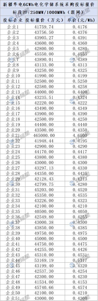 标段四:250MW/1000MWh,跟网型磷酸铁锂电化学储能系统,包括0.25C磷酸铁锂电化学储能系统(包含电池)的供货及指导安装,电池单体容量≥314Ah。共50家企业有效报价(51家投标,50家有效报价),报价范围0.4050-0.5317元/Wh,平均投标报价0.4391元/Wh。