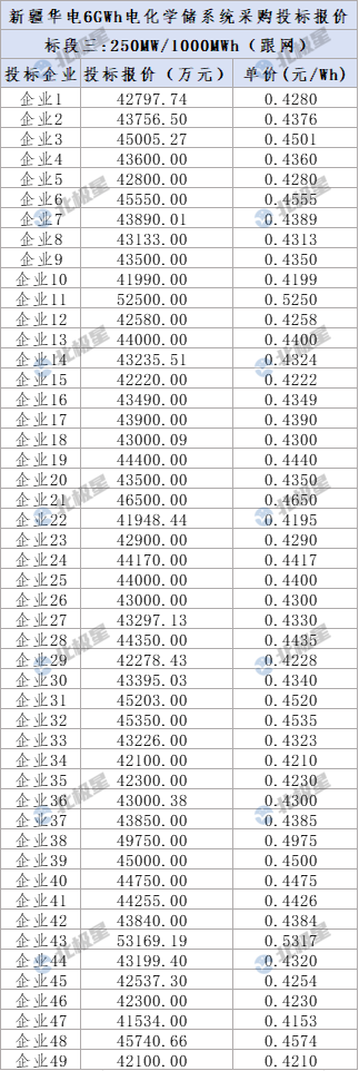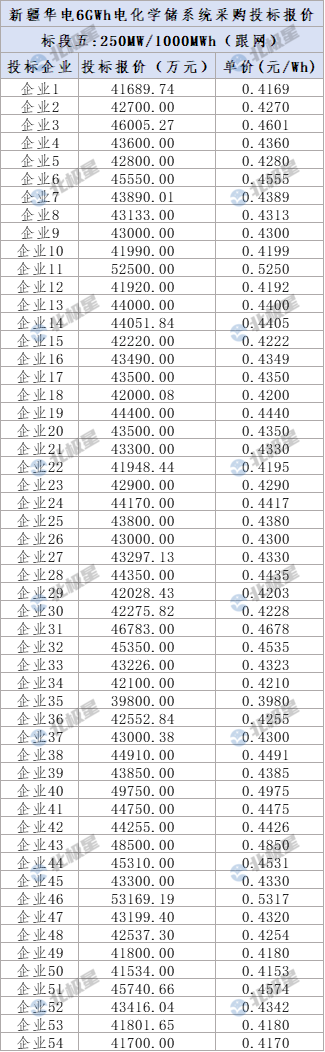 标段五:250MW/1000MWh,跟网型磷酸铁锂电化学储能系统,包括0.25C磷酸铁锂电化学储能系统(包含电池)的供货及指导安装,电池单体容量≥314Ah。共54家企业投标,报价范围0.3980-0.5317元/Wh,平均投标报价0.4388元/Wh。