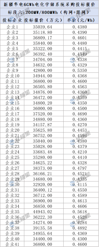 标段六:200MW/800MWh,构网型、跟网型磷酸铁锂电化学储能系统,包括0.25C磷酸铁锂电化学储能系统(包含电池)的供货及指导安装,电池单体容量≥314Ah。共41家企业投标,报价范围0.4270-0.5618元/Wh,平均投标报价0.4510元/Wh。
