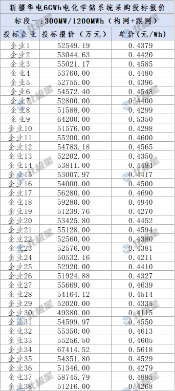 3月14日,新疆华电1.5GW/6GWh储能系统采购开标。6个标段共吸引57家企业参与投标,整体报价范围为0.398元/Wh-0.565元/Wh,投标均价0.4452元/Wh。