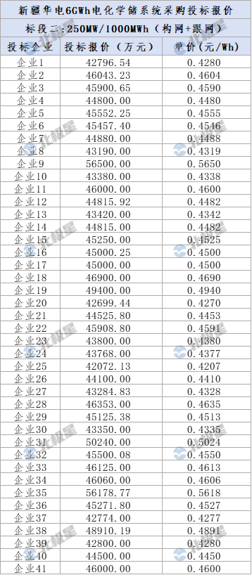 标段二:250MW/1000MWh,构网型、跟网型磷酸铁锂电化学储能系统,包括0.25C磷酸铁锂电化学储能系统(包含电池)的供货及指导安装,电池单体容量≥314Ah。共吸引了41家企业投标,报价范围0.4207-0.5650元/Wh,平均投标报价0.4557元/Wh。