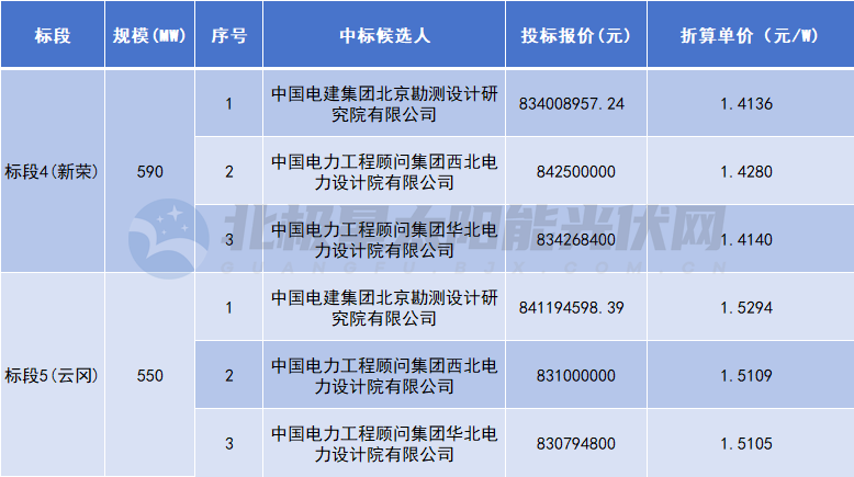 根据公示,两个标段分别有3家企业入围,报价区间在1.4136~1.5294元/W,详见下表: