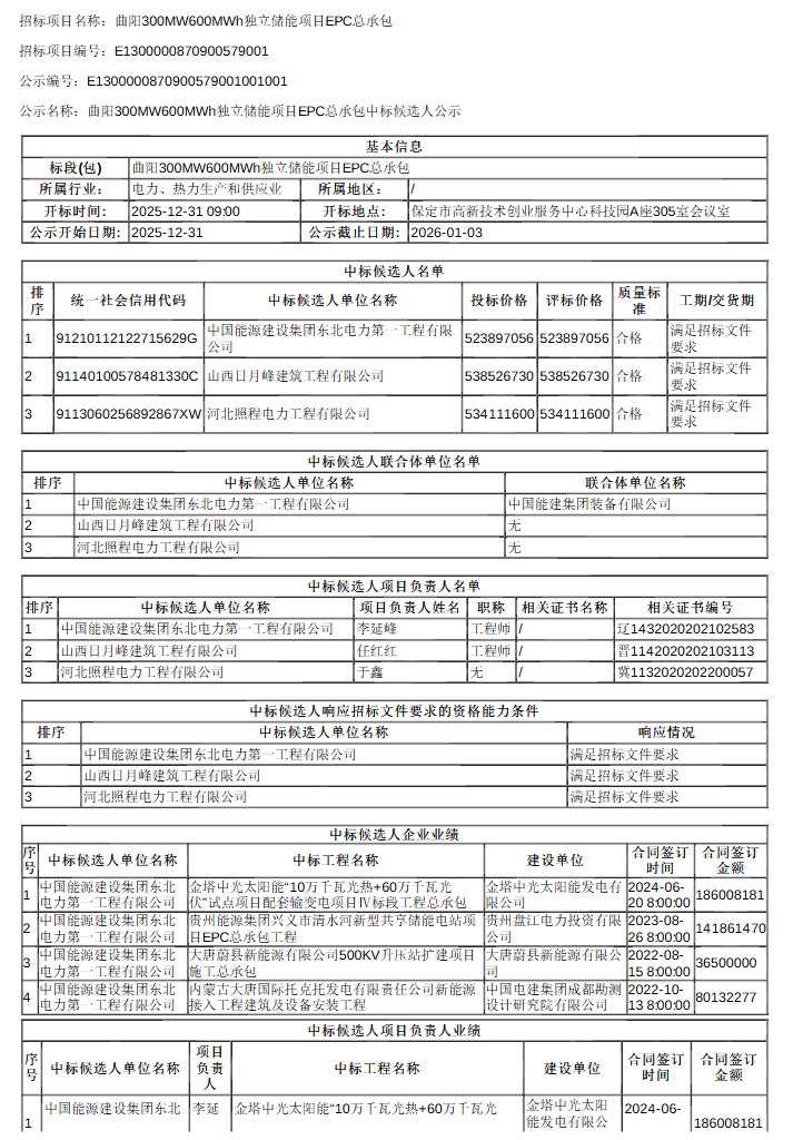 此前开标记录显示,共有四家投标,包括中振建设有限公司、山西日月峰建筑工程有限公司、中国能源建设集团东北电力第一工程有限公司、河北照程电力工程有限公司。