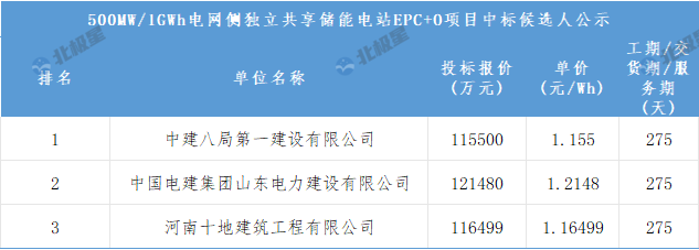 1月15日,莱阳柔性储能科技有限公司发布山东烟台莱阳市大夼镇500MW/1GWh电网侧独立共享储能电站EPC+O项目中标候选人公示,其中,中标候选人第一名为中建八局第一建设有限公司,投标报价115500万元,约合单价1.155元/Wh;中标候选人第二名为中国电建集团山东电力建设有限公司,投标报价121480万元,约合单价1.2148元/Wh;中标第三名为河南十地建筑工程有限公司,投标报价116499万元,约合单价1.16499元/Wh。