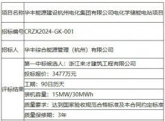 5月8日,华丰能源建设杭州电化集团有限公司电化学储能电站项目EPC 中标候选人公示发布,项目装机容量15MW/30MWh。浙江来才建筑工程有限公司以3477万元预中标该项目,折合单价1.159元/Wh。...